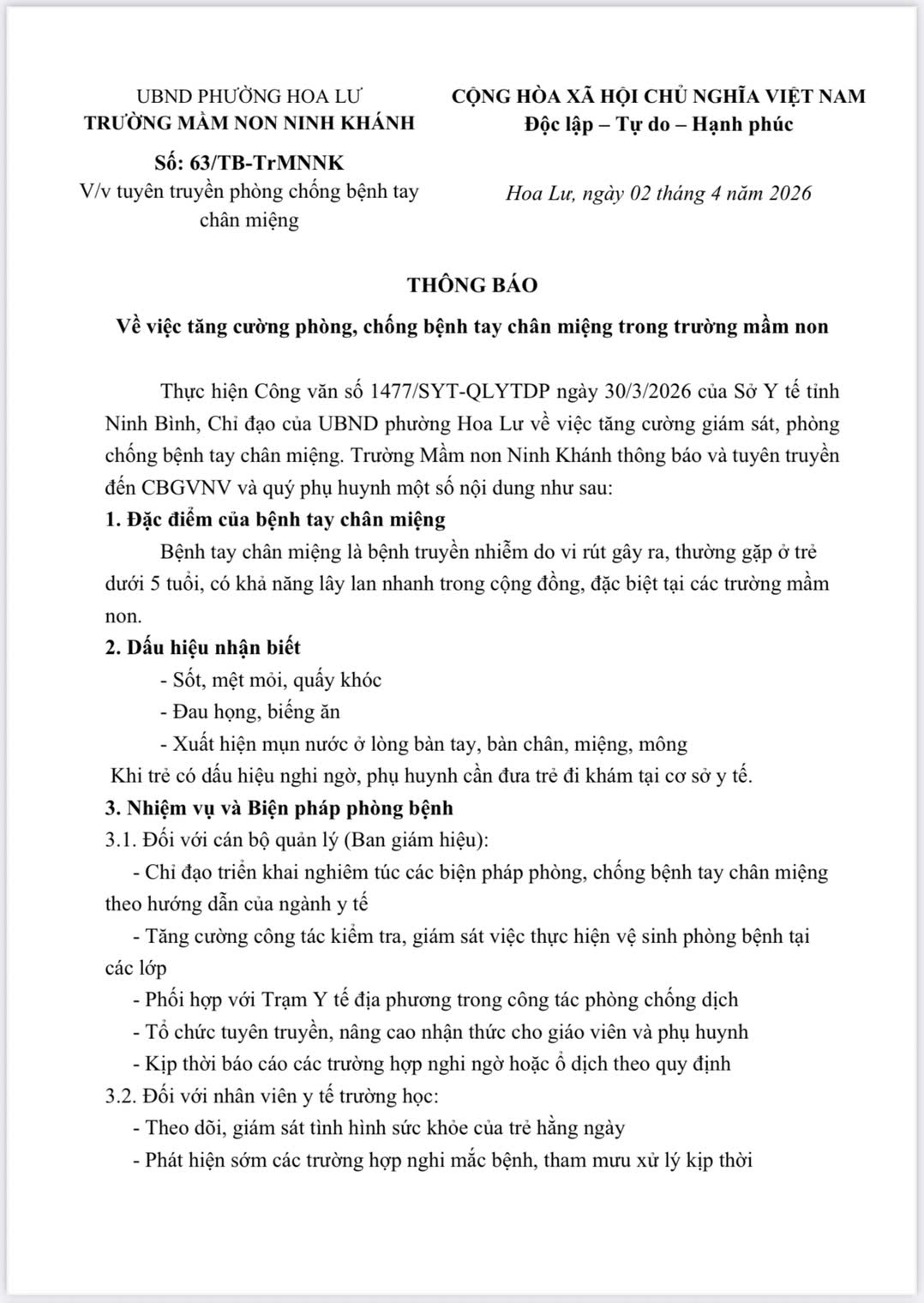 Trước diễn biến của dịch bệnh, thực hiện chỉ đạo của Sở Y tế tỉnh Ninh Bình và UBND phường Hoa Lư, Trường Mầm non Ninh Khánh xin thông tin đến các bậc phụ huynh về việc chủ động phòng chống bệnh Tay chân miệng như sau: