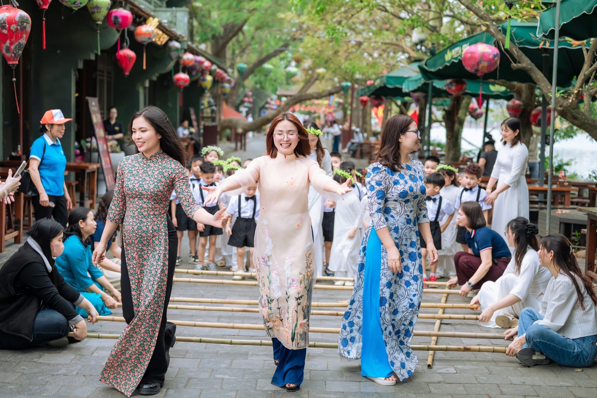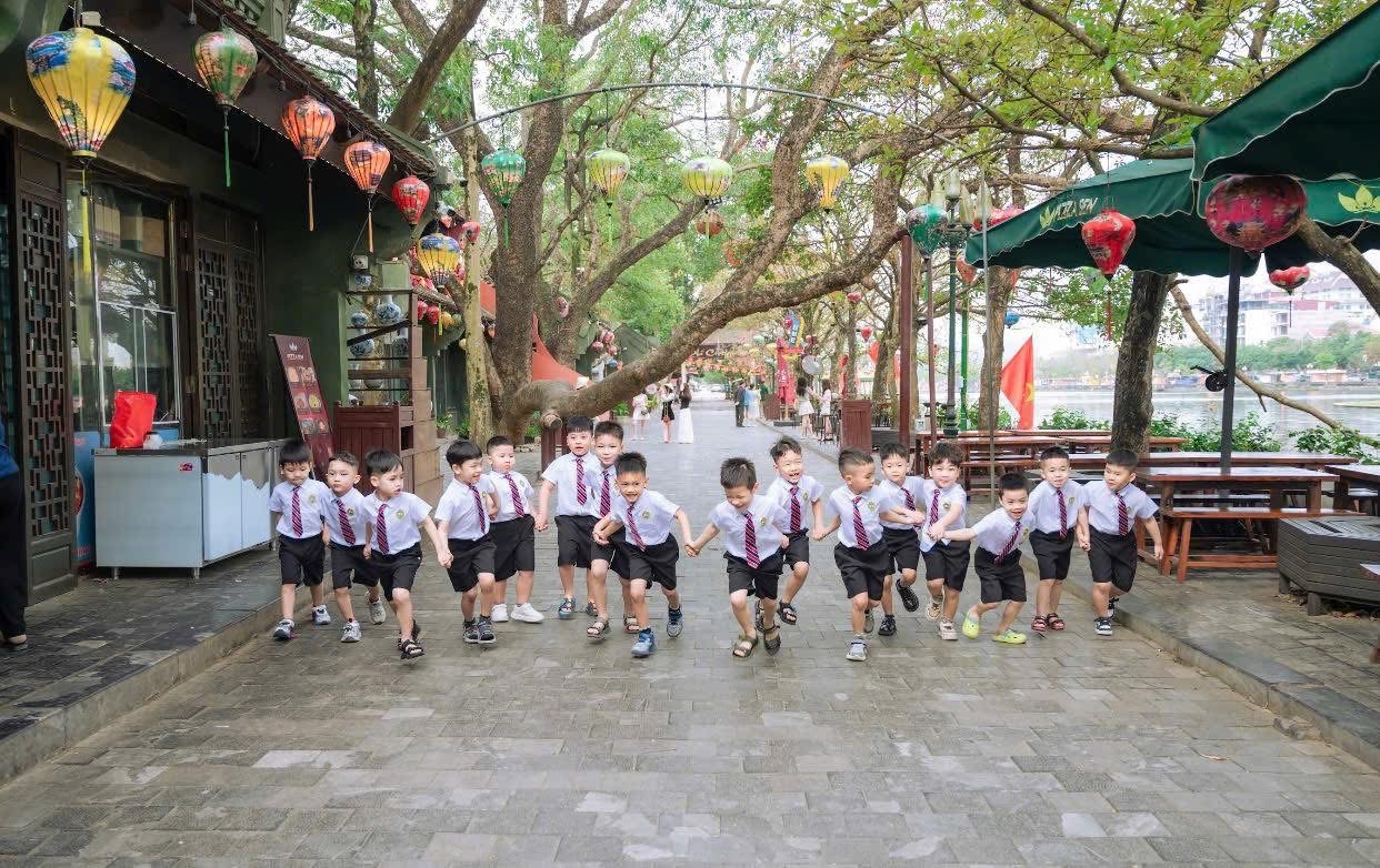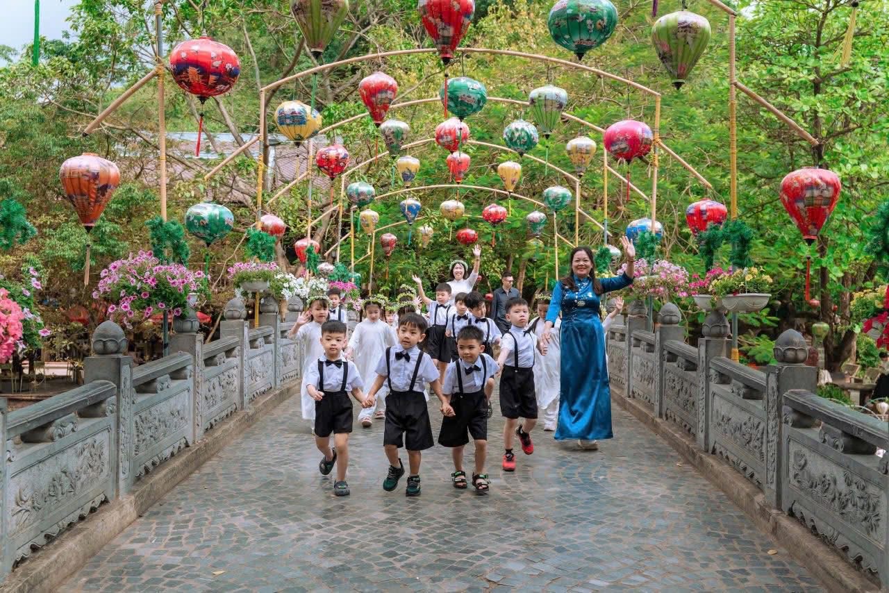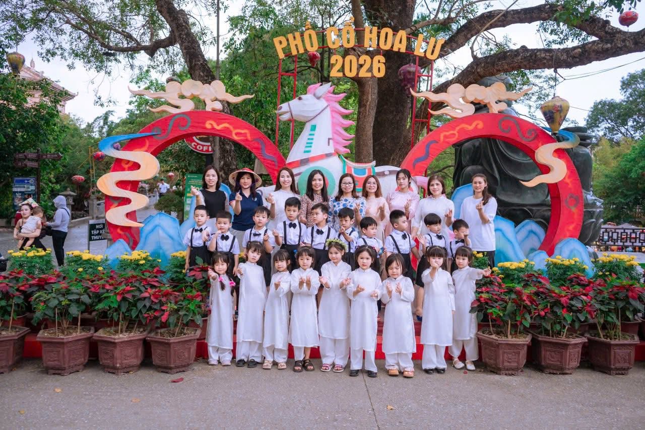 • Tìm hiểu di sản: Các con được các cô giáo giới thiệu về vẻ đẹp kiến trúc truyền thống, những gian hàng thủ công mỹ nghệ và nét văn hóa đặc sắc của vùng đất cố đô. Ánh mắt trẻ thơ không khỏi trầm trồ trước những chiếc đèn lồng lung linh và không gian mô phỏng làng quê xưa.